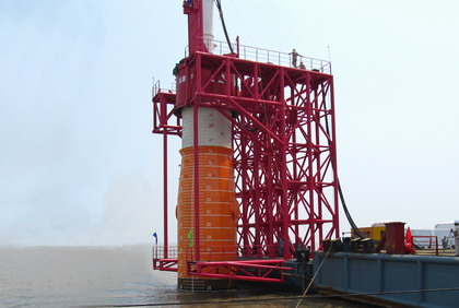为了完成本次打桩任务,龙源振华公司在各方协助下,认真学习海上风力电场打桩经验,快速掌握打桩要领,经过两天两夜海上施工一切准备就绪,历时两个小时,成功打下我国第一根海上风电工程单管桩。
