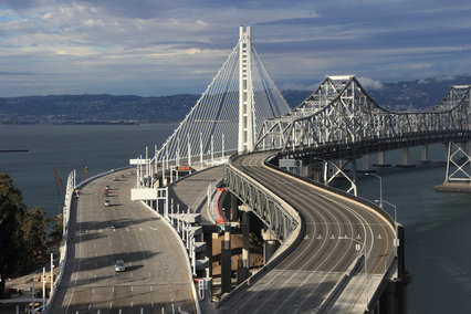 新海湾大桥全长2.88公里,双向共有12车道,设计日均汽车流量达30万辆,是旧金山市与外界的交通咽喉,可抗八级地震。桥上安装了2万5千盏节能灯,变化出多种图形,使其当之无愧地代替金门大桥成为旧金山的新地标,并与东海岸的自由女神像遥相呼应。