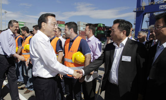 在ZPMC起重机下,双方总理发表了演讲。李克强强调,中希在比港的合作不仅有利于中希两国,有利于稳定、繁荣、平衡发展的欧洲,也有利于世界。中方愿与希方携手并进,让比港这颗中希合作的明珠闪烁更加夺目的光芒。